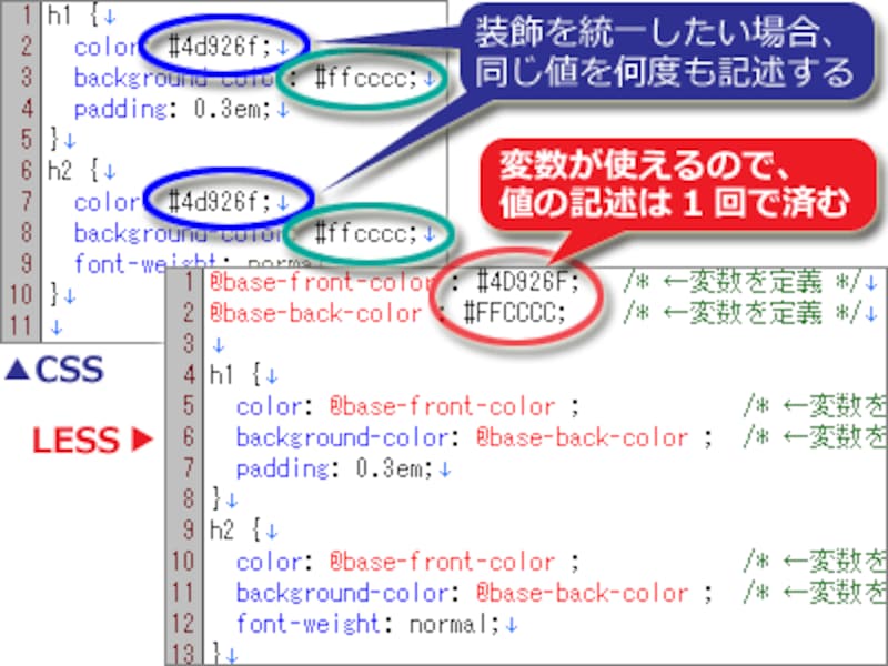 変数は、LESS の重要な機能の一つです。変数を使用することで、コード全体に一貫性を持たせ、維持性と可読性を向上させることができます。たとえば、頻繁に使用される色やフォントなどに名前をつけて定義することができます。これにより、コードの変更や修正が容易になります。