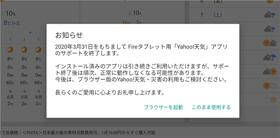 Fireタブレット用「Yahoo!天気」アプリのサポート終了について