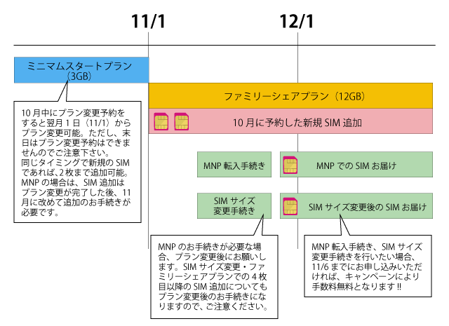 また、プラン変更とSIMカードの交換を同時に実行する場合、プラン変更の効力は最寄の契約更新日からになります。したがって、プラン変更とSIMカードの交換を同時に実行する場合は、契約更新日のタイミングを考慮する必要があります。