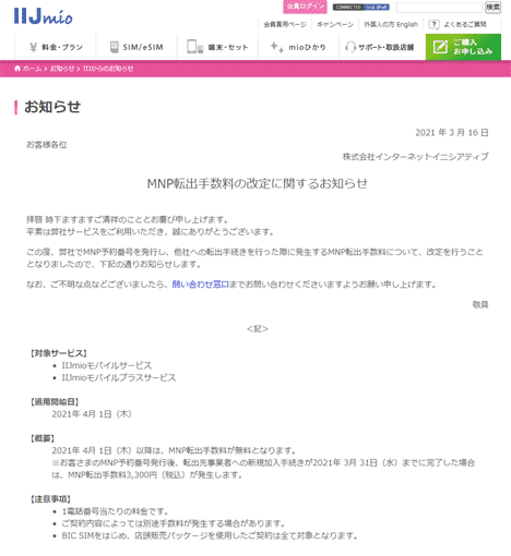 # IIJmio、MNP転出手数料を無料化。2021年4月1日より適用開始